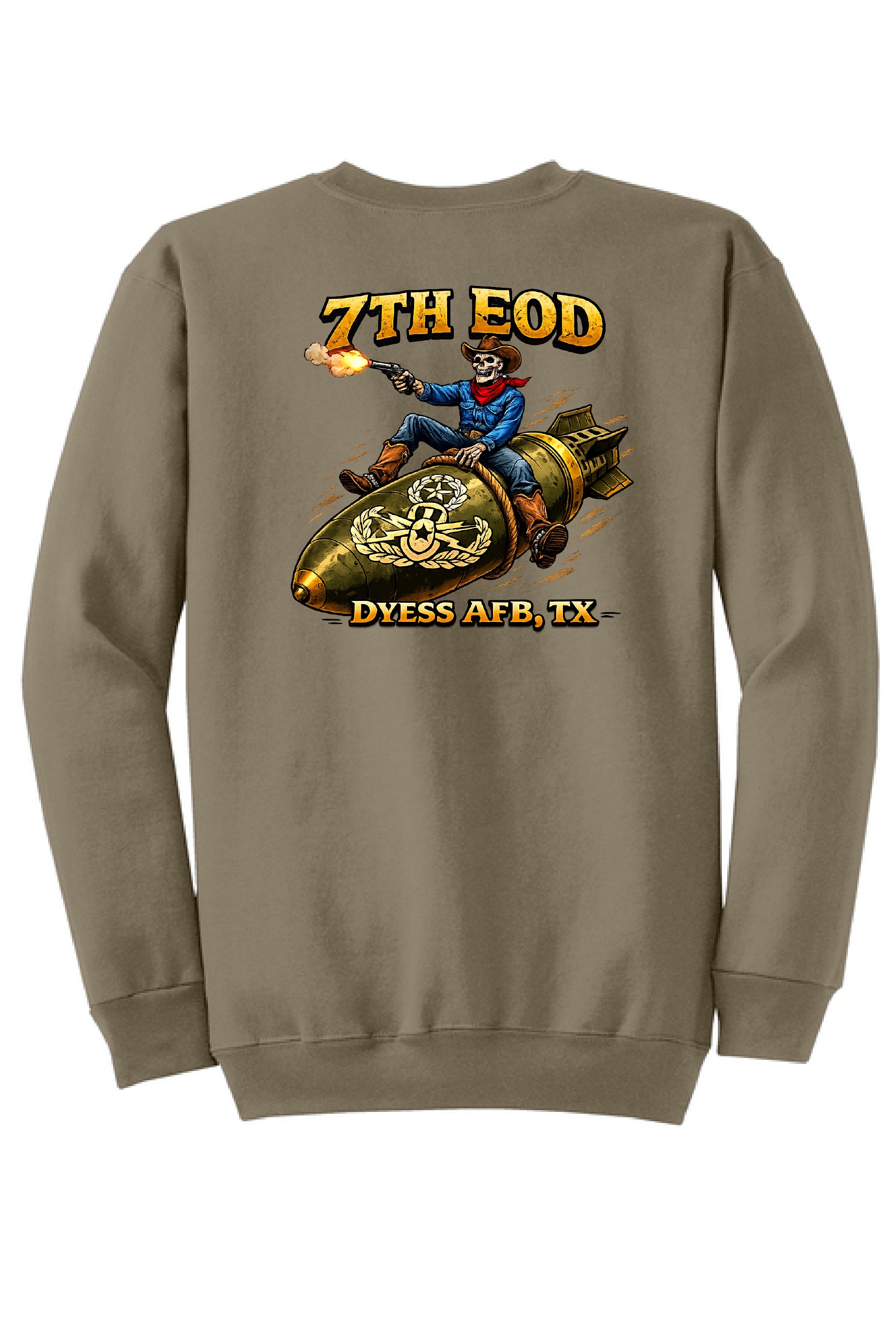 Clean, simple, and built to represent. This 7th EOD Cowboy Sweatshirt features a one color EOD Badge on the left chest and large back print of the Skeleton Cowboy.