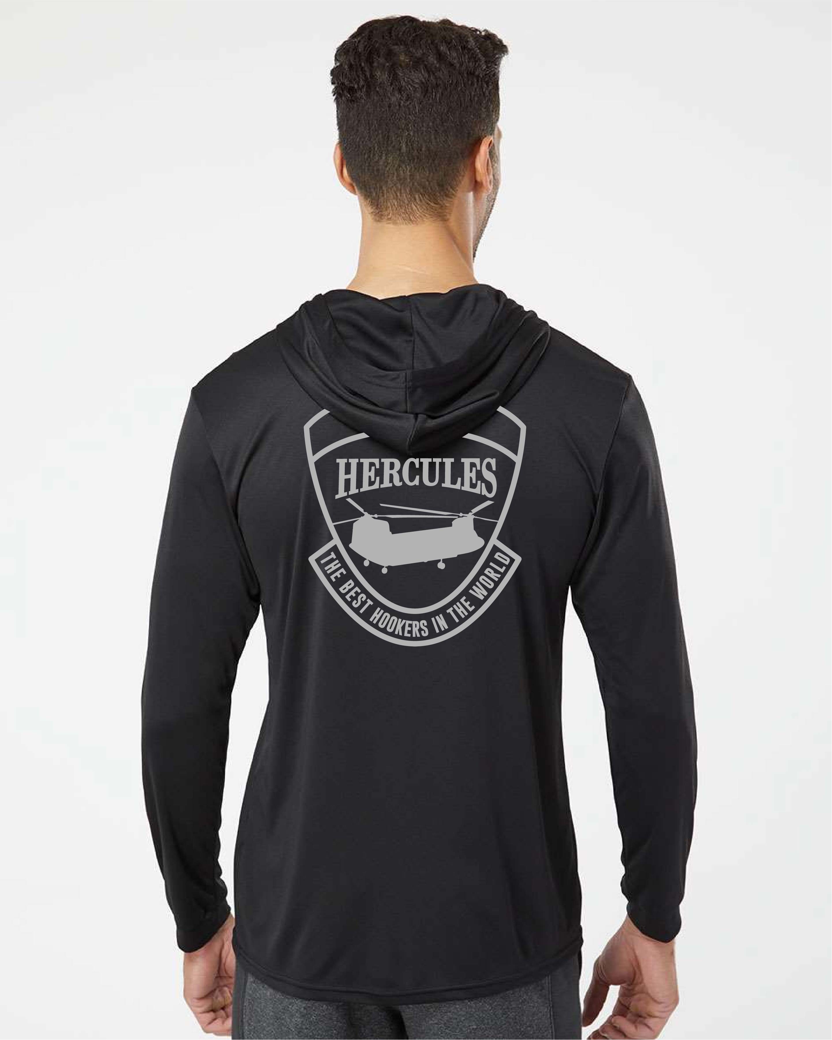 The one-color Hercules design is printed large on the back, putting heavy-lift pride on full display — rotors turning, hooks hanging, and a reminder that some problems are solved with horsepower and confidence.