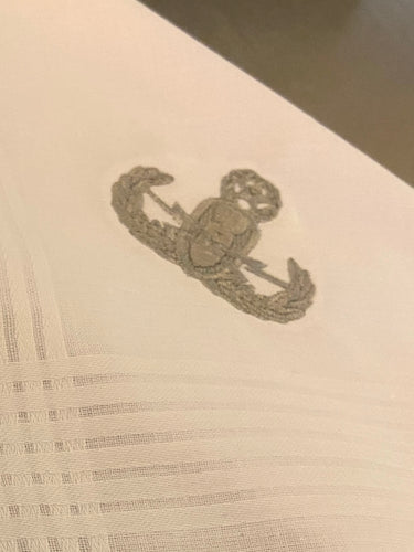 Tactical meets traditional with this classic 16x16-inch white cotton handkerchief, custom embroidered with the iconic EOD crab. Whether you're wiping sweat after a long day on the range or adding a subtle nod to your profession at a formal event, this piece blends utility with pride.