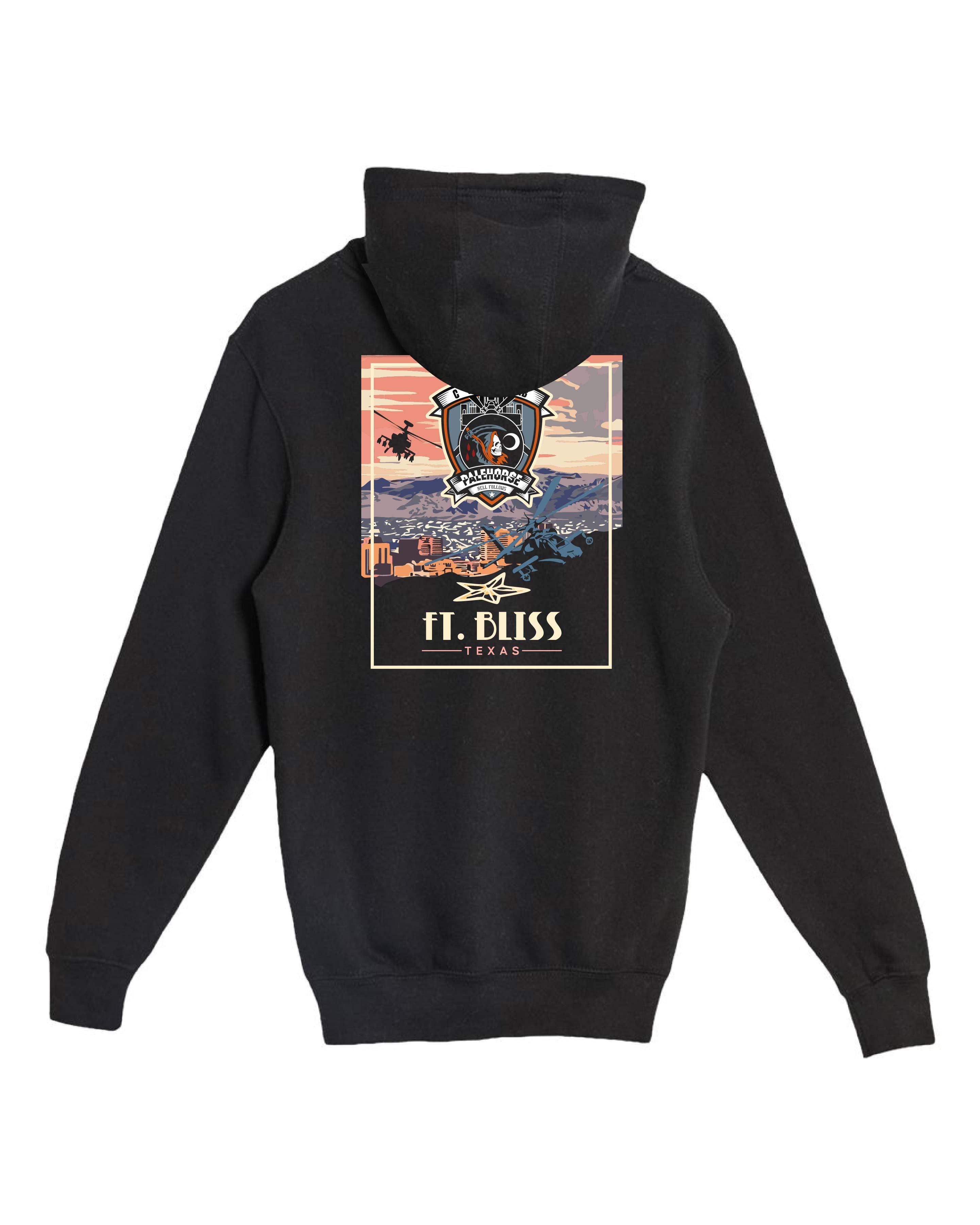 Featuring a the Fort Bliss Skyline on the back in full color, and the Palehorse Emblem on the left chest.