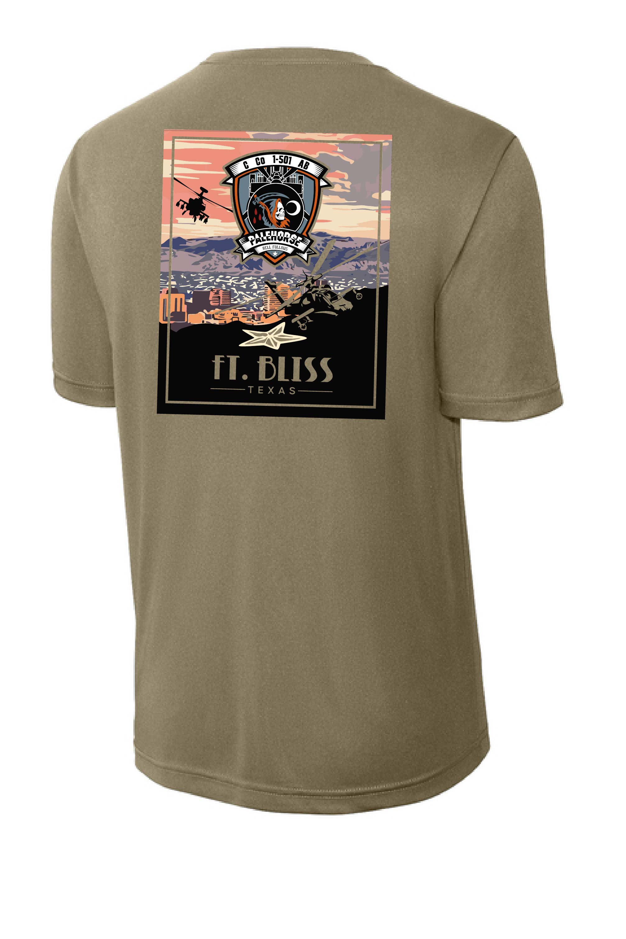 Featuring a the Fort Bliss Skyline on the back in full color, and the Palehorse Emblem on the left chest.