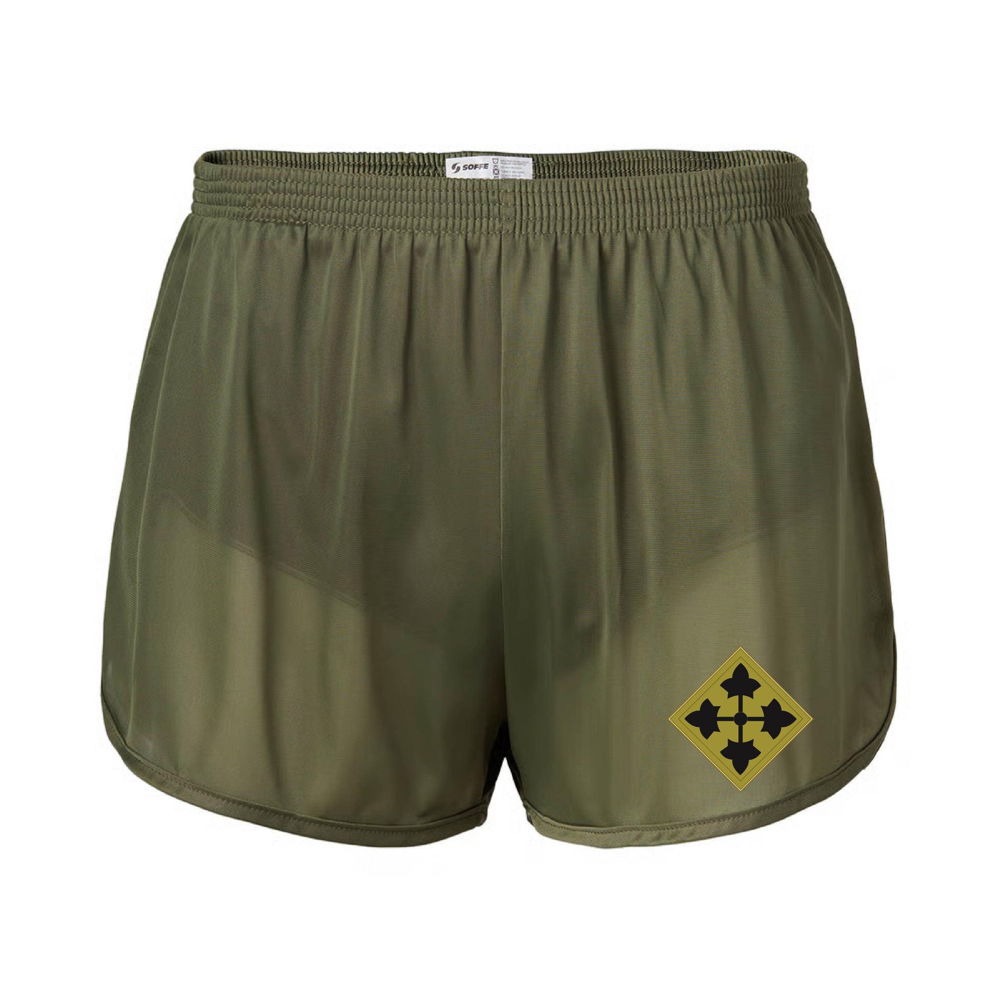 Soffe Silkies featuring the 4th Infantry Division Emblem on the left thigh. The 4th ID emblem is available in either traditional or subdued/tactical coloring.