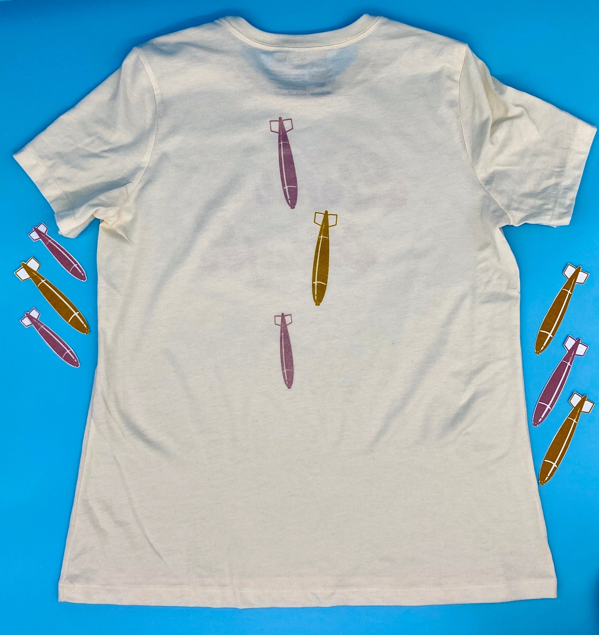 This women's cut tee features an FBOMB Designs exclusive design in your choice shimmering Gold Metallic or Rose Gold Metallic Ink on the front with the words "Bombs & Boujee." The back has a fun little detail of bombs cascading down from your neck in alternating colors.
