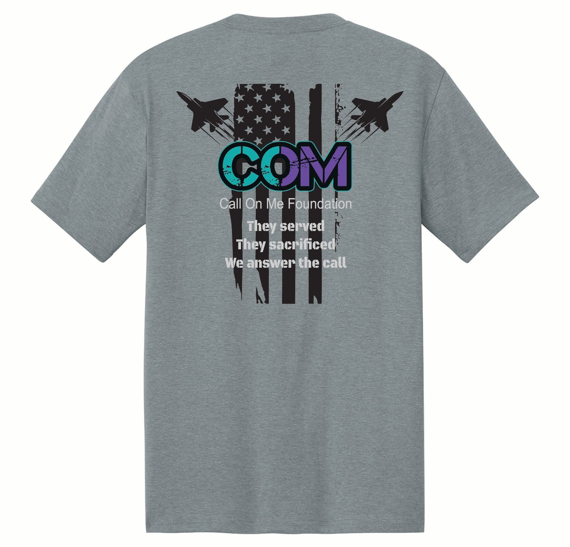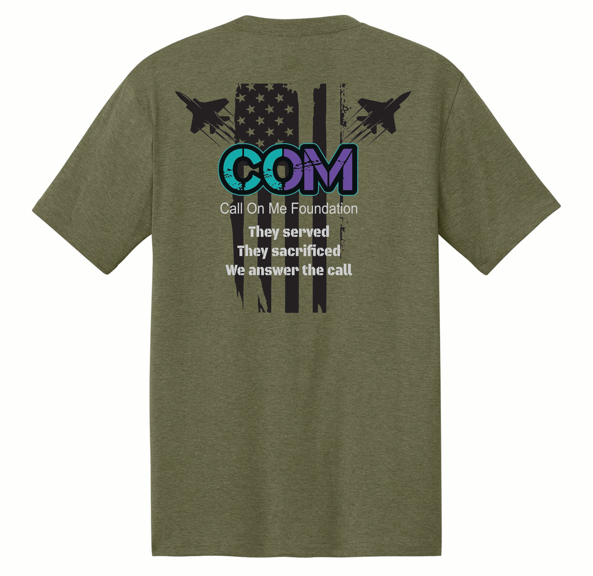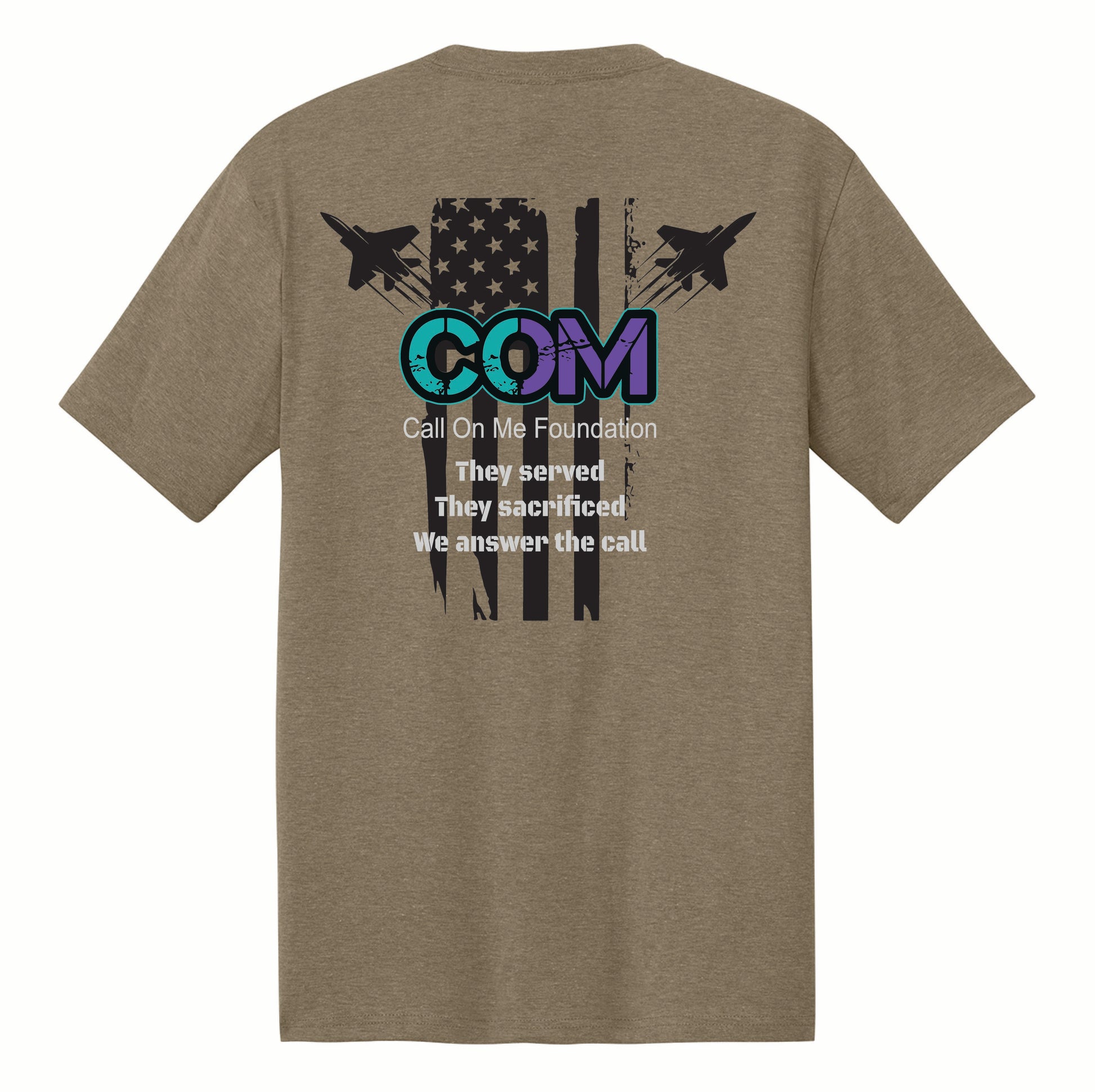This ultra-soft triblend shirt features the bold Color Block COM logo with the American on the back showcasing the words "They Served, They Sacrificed, We answered the Call" — a symbol of hope, help, and heart.