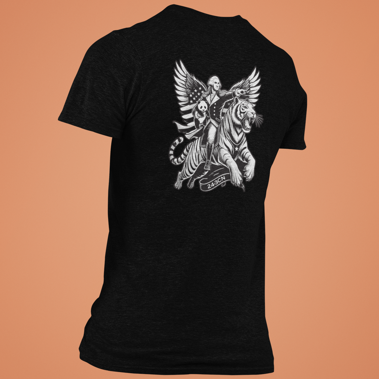- George Washington holding a Panda as he rides a tiger with wings as a large print on the Back