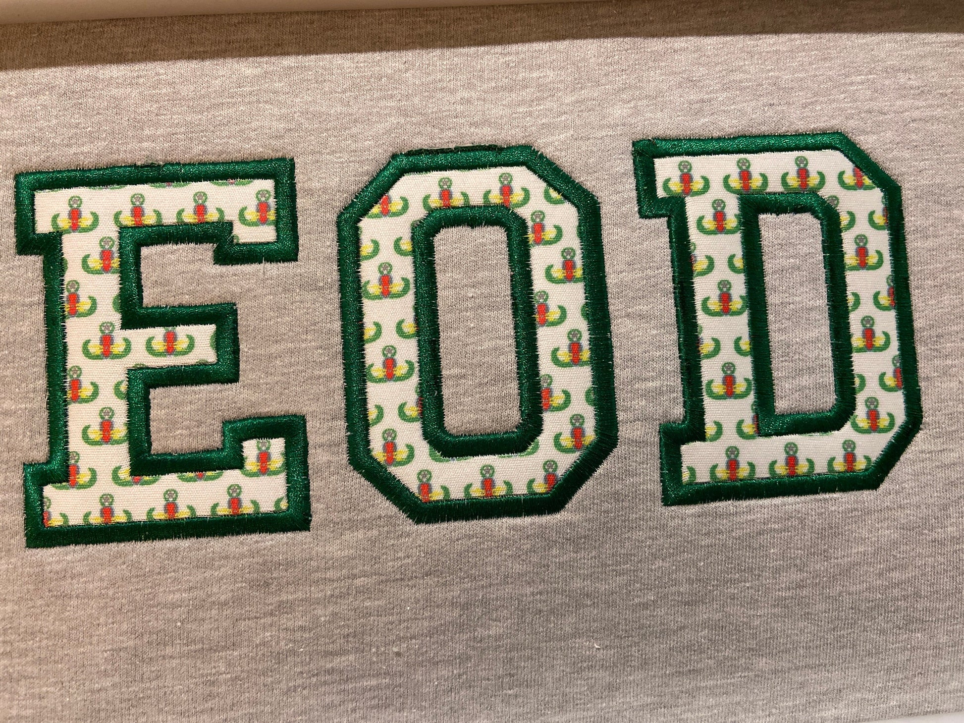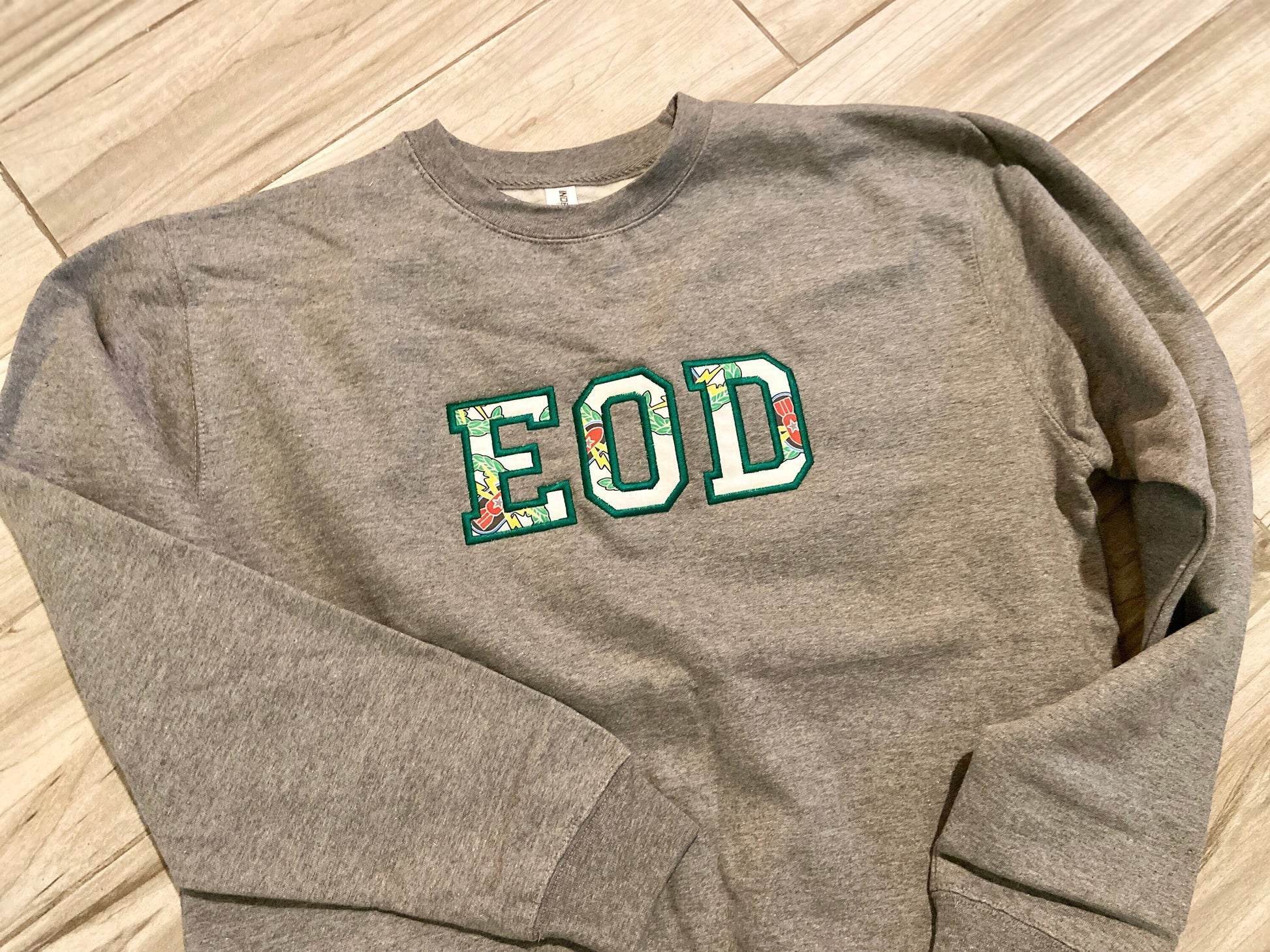 I love to applique! And this crewneck sweatshirt is the perfect medium to put this love to work! The basic cost features the letters EOD with fabric of a basic, senior or master crab. Sweatshirt in the photo is featuring the senior level crab.