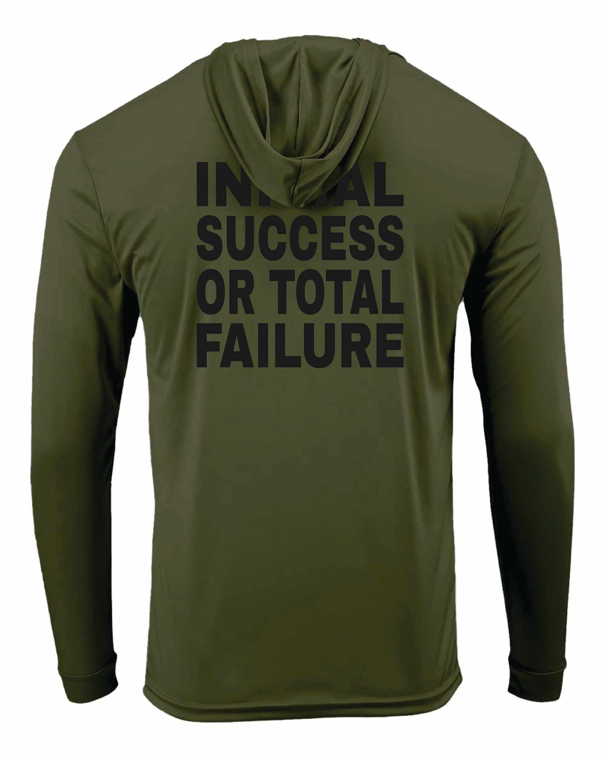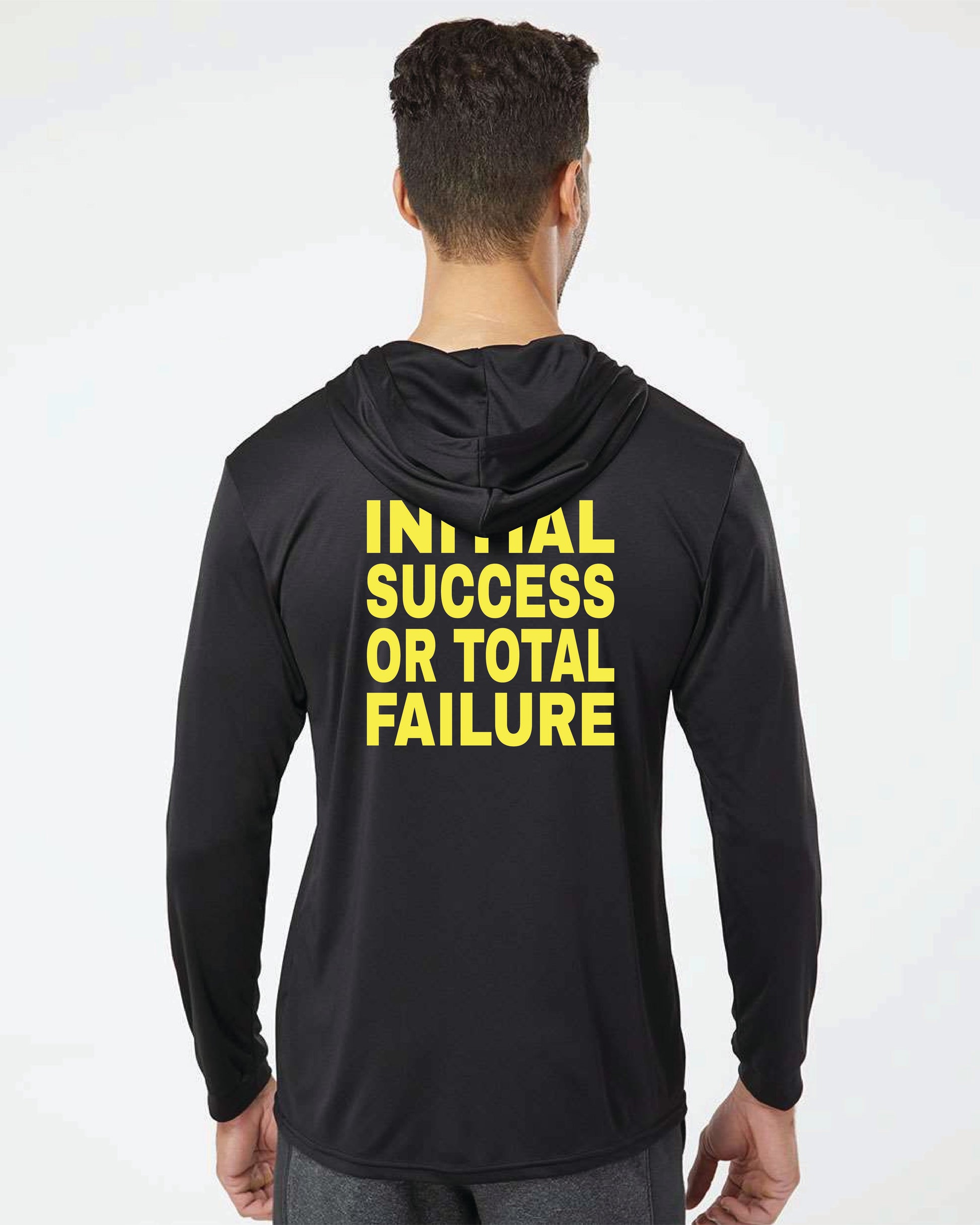 - This isn’t your average hoodie—it’s a mission-ready performance sun shirt built for those who walk the line between calm and chaos. Featuring a bold “INITIAL SUCCESS OR TOTAL FAILURE” print on the back, this lightweight, long-sleeve hooded shirt keeps you covered while letting everyone know exactly what kind of pressure you thrive under.