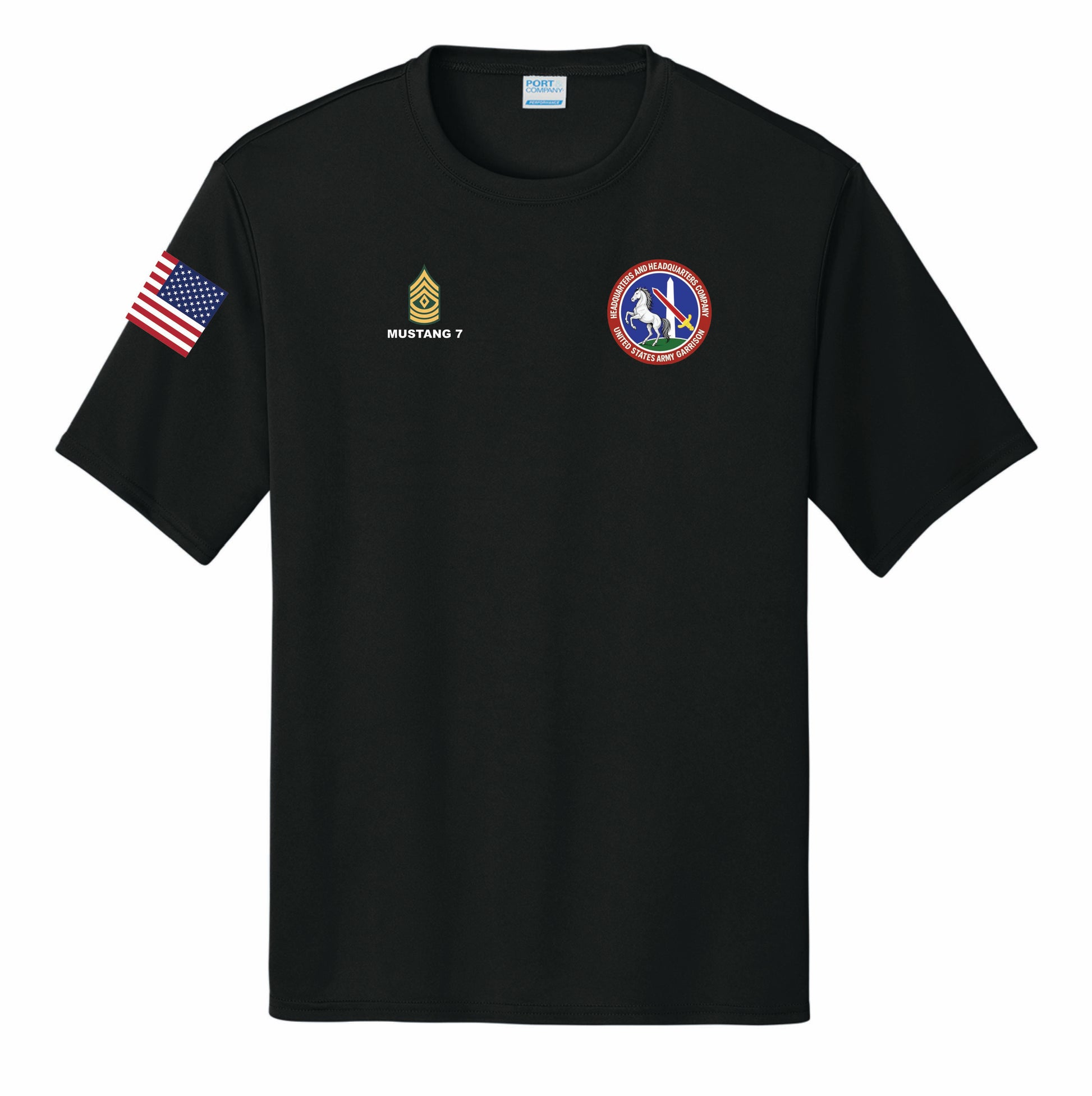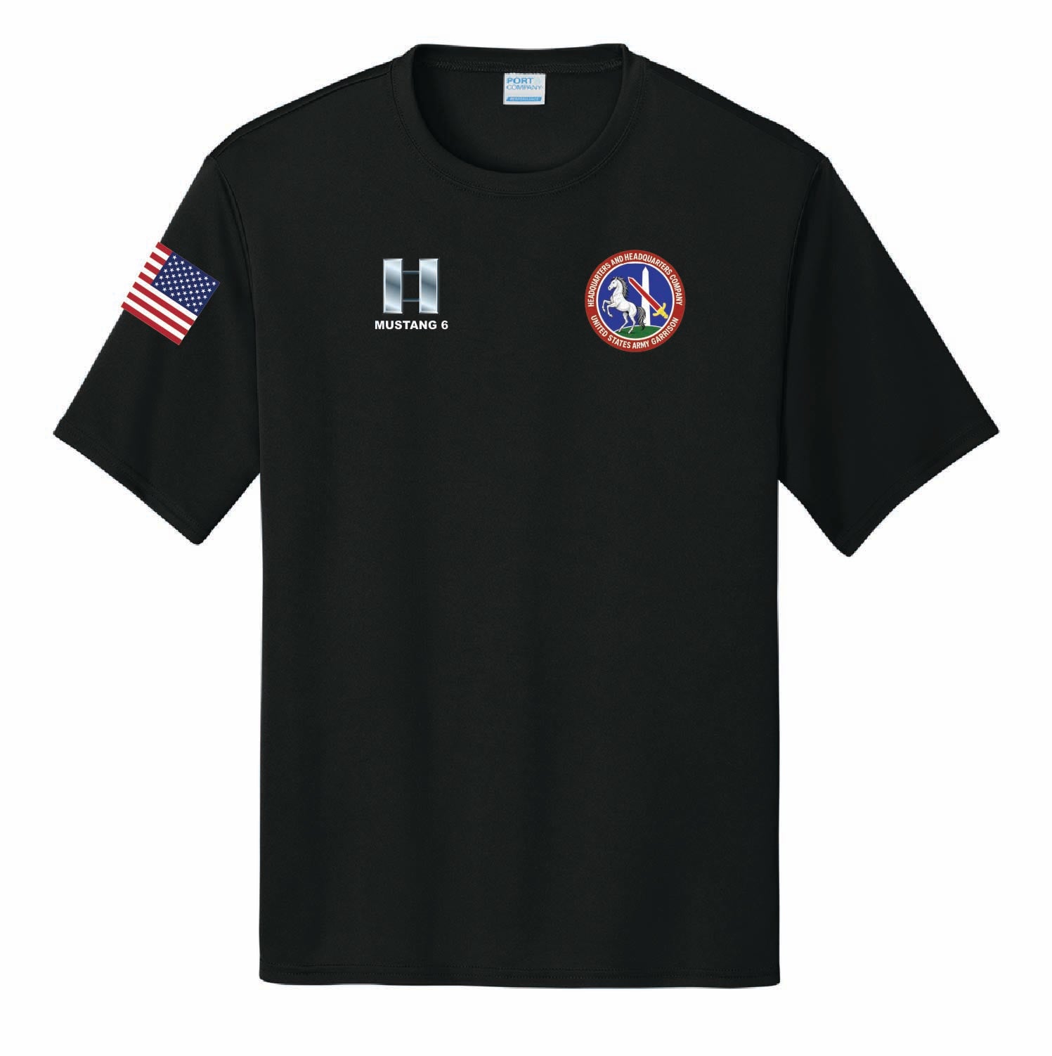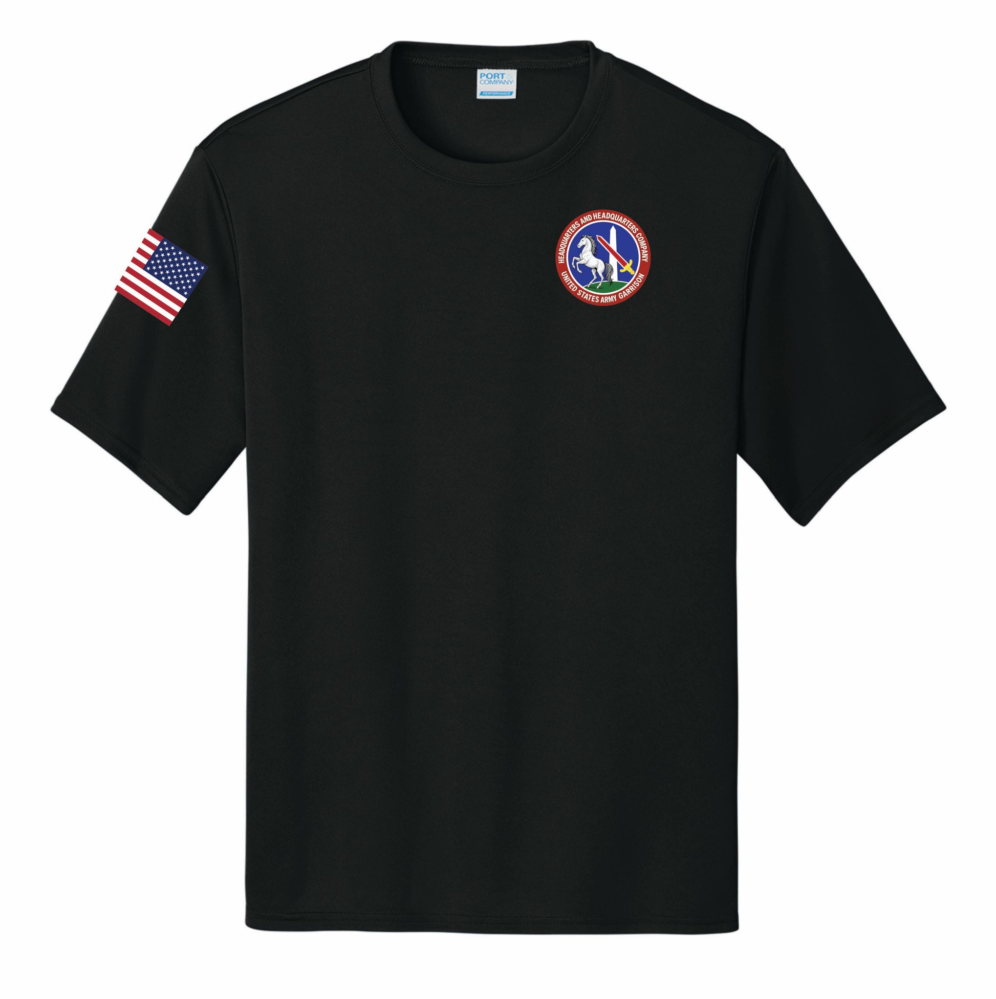 This black performance tee represents the pride and professionalism of the Headquarters and Headquarters Company at Joint Base Myer-Henderson Hall. Featuring a bold rearing white mustang on the back with the unit’s rallying call, and the official HHC crest on the front left chest, this tee delivers sharp looks and all-day comfort.
