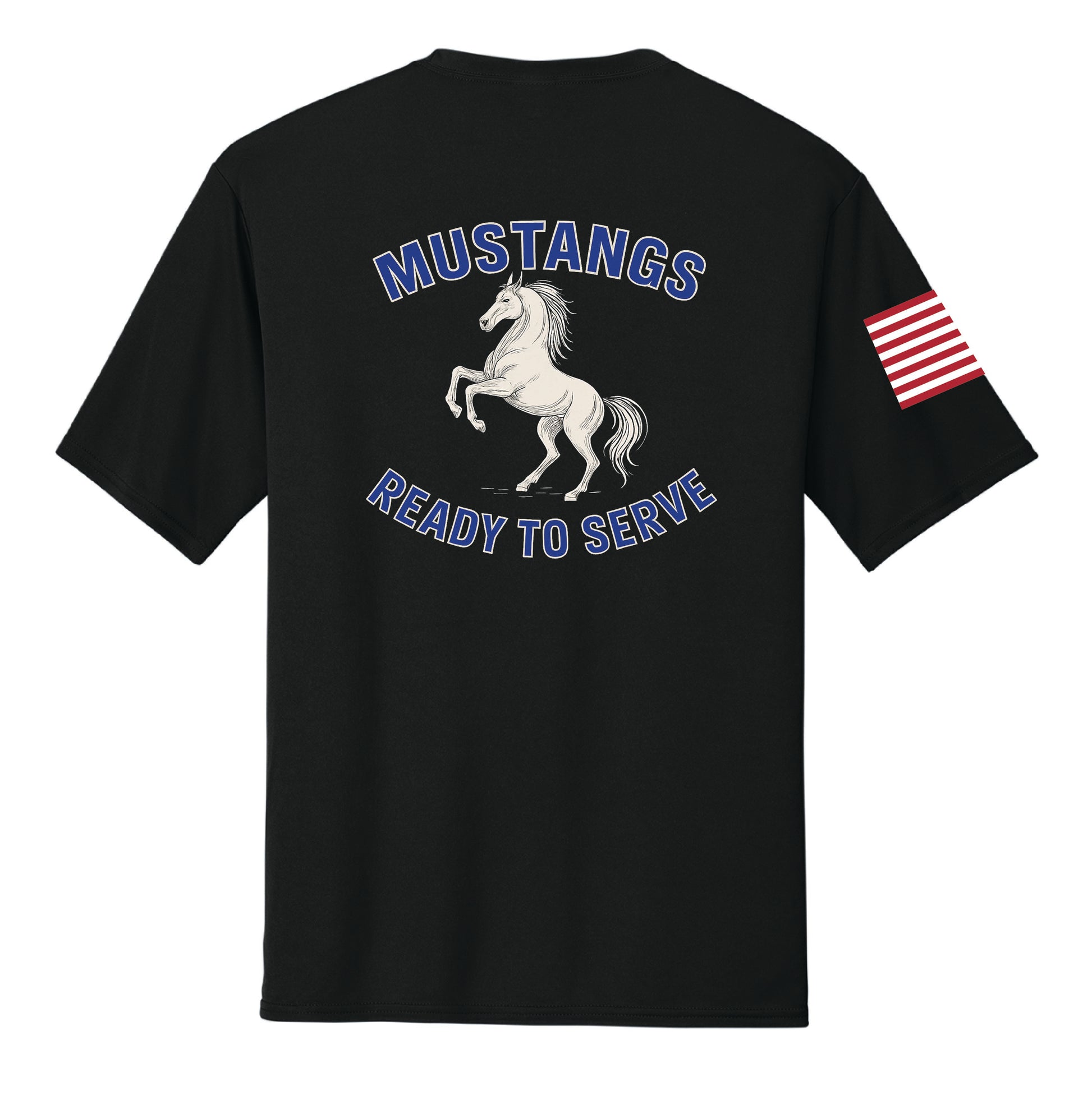 Back print: White mustang with “Ready to Ride, Ready to Serve”