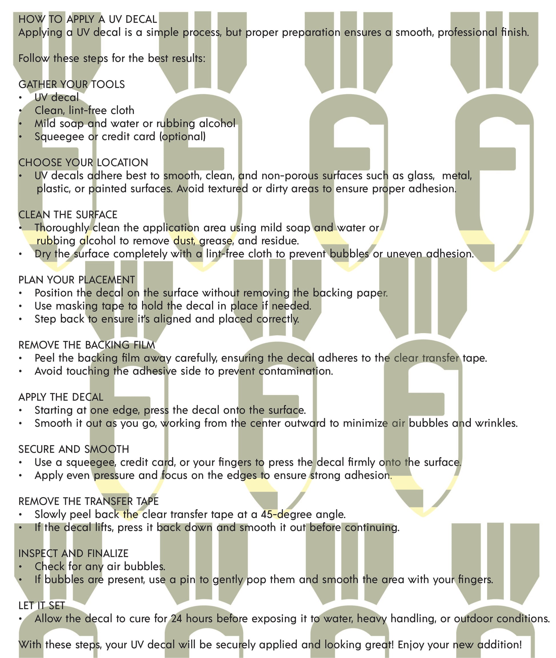 Whether you're branding your business, decorating your space, or adding custom designs to your vehicle, UV decals deliver superior quality and longevity where vinyl stickers may fall short. Choose UV decals for a professional, polished, and long-lasting look!