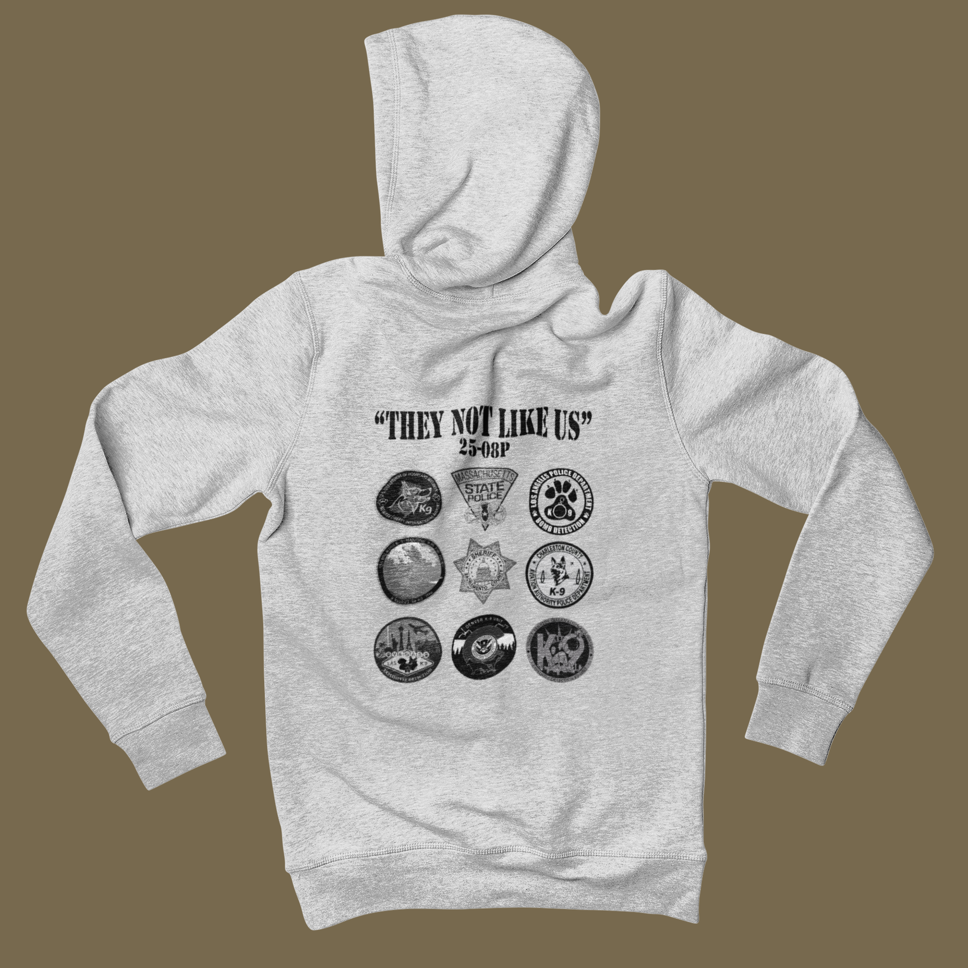 This isn’t just a hoodie—it’s a badge of honor. Designed for the handlers and hounds of K9 Class 25-08P, this hooded sweatshirt features a bold display of unit logos and the class motto: “They Not Like Us.” Whether you're working the beat or training hard, this hoodie reps the bond between you and your four-legged partner like nothing else.